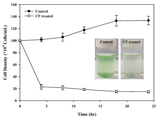 According to our previous study [17], the extent of the amine groups retained on the adsorbent is critical for the M. aeruginosa cell adsorption, since the negatively charged cyanobacterial cells can be bound to the cationic amine groups by electrostatic interaction. The raw material (chitosan) chosen for this study is a well-known biopolymer, and is predominantly composed of numerous amine groups. Furthermore, the analysis of the functional group properties of the fabricated CF (made of chitosan) showed that the amine groups were present in the fabricated sorbent without any deterioration or denaturalization. Therefore, we hypothesized that CF might be suitable in the adsorptive removal of harmful cyanobacterial cells directly from an aqueous medium. To test this hypothesis, the M. aeruginosa removal potential of CFs was evaluated by comparing the growth profiles of the cyanobacterial cells cultured with and without CF in the BG11 medium, with an initial cell concentration of (100.0 ± 1.52) × 104 cells/mL. The control sample demonstrated the continuously increasing cell density of M. aeruginosa until it reached (133.3 ± 7.13) × 104 cells/mL after 24 h (Figure 1). In contrast, the addition of CF suppressed the cyanobacterial cell growth. Thus, CF has the qualities of a biosorbent, and can remove the M. aeruginosa cells directly from the aqueous medium. In the CF-treated sample, the cell concentration of M. aeruginosa significantly decreased within the first 5 h of the treatment, as compared to its initial concentration. After 5 h of the treatment, the cell density slowly diminished and reached (14.8 ± 2.03) × 104 cells/mL after 24 h. Based on these results and taking into account the initial and control sample cell densities, the estimated removal efficiencies of CF were 85.2% and 88.9%, respectively. To determine whether these results are statistically significant (p-value), a t test was conducted using the control and experimental data groups. The p-value obtained from the statistical analysis was close to zero (0.0002). This indicates that the harmful cyanobacterial cells could be efficiently removed by the CF treatment.