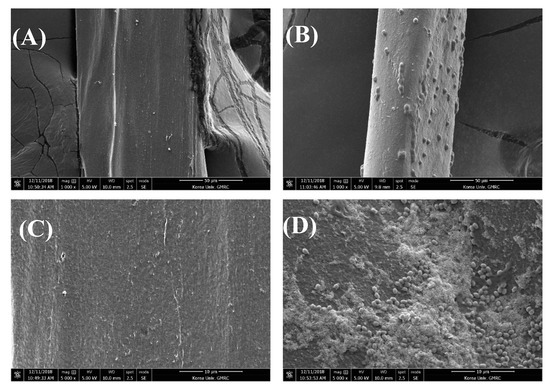 FE-SEM images of chitosan fibers before (A,C) and after (B,D) the M. aeruginosa treatment in BG11 medium. The magnifications are ×1000 (A,B) and ×5000 (C,D).