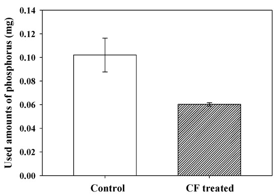 Phosphorus consumption in the control and CF-treated samples for 24 h of cultivation time. The initial amount of phosphorus in 150 mL of BG11 medium equaled 0.663 ± 0.01 mg (initial phosphorus concentration = 4.42 ± 0.05 mg/L).