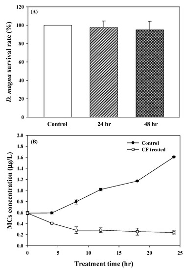 As stated above, CF is a feasible controller of the targeted cells and can be utilized for the direct treatment of Cyano-HABs in natural water bodies. However, various putative environmental factors of sorbents, including their toxicity, must be verified before their utilization in water bodies. To determine this, the toxicity of fabricated CF was evaluated using the acute toxicity test, by cultivating D. magna with CF according to the EPA guideline [28]. The toxicity test results for CF (Figure 4A) showed that the survival rates of D. magna were not significantly affected by the presence of CF; this result was achieved by using the same concentration of CF that was applied in the M. aeruginosa cell removal test. After 24 and 48 h of cultivation time, the survival rates of D. magna were 97.5% ± 7.07% and 95% ± 9.26%, respectively, as compared to those of the control sample (100%). These results indicate that CF did not cause any toxicity.