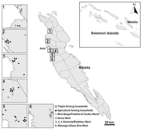 This study took place across five wards in Malaita (see Figure 2). These wards included West Baegu/Fataleka, Fauabu, Buma, Keaimela/Radefasu and Waneagu Silana Sina, which together have 30,911 inhabitants and account for 23% of the total rural population of Malaita Province in 2009 [30]. Wards are the smallest electoral divisions that constitute the nine administrative areas run by the Provincial Government [33]. The wards in this study were selected because they hosts one of the only established networks of tilapia farmers in the province. Furthermore, Malaita Province holds the largest group of tilapia farmers across all provinces of Solomon Islands. Although Mozambique tilapia can be found in Lees Lake on Guadalcanal Province and Lake Tegano on Renbel Province [26], there were no reported Mozambique tilapia aquaculture activities in these provinces at the time of this study.