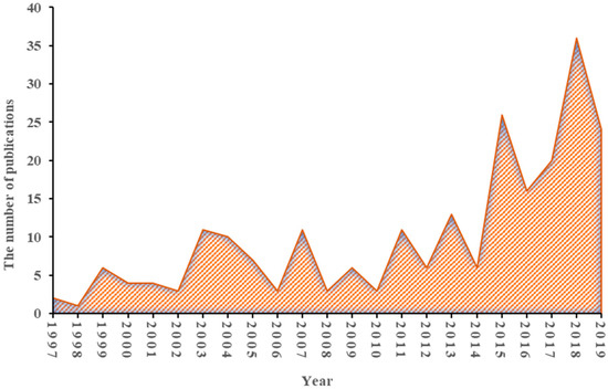 Chronological distribution of phytomining research publications in Web of Science Core Collection (1997–2019).