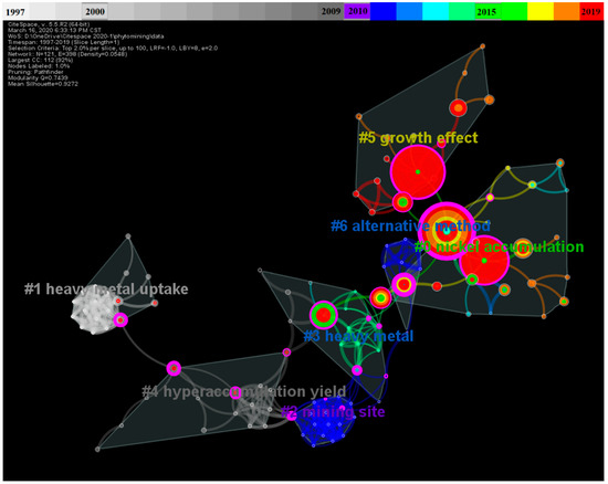 Cluster #4, called “hyperaccumulation yield,” has 15 member references, a silhouette value of 0.836, and a mean year of 2001. The actively cited publications in this cluster are mainly about metal hyperaccumulators. In nickel hyperaccumulators (A. bertolonii (Desv), A. lesbiacum (Candargy), and Thlaspi goesingense (Halacsy)), nickel was mainly distributed in the epidermal cells of the stems and leaves, followed by the boundary cells between the cortical parenchyma and the vascular cylinder. Cellular compartmentation can effectively reduce nickel toxicity to these hyperaccumulators [52]. Articles with the most citations in cluster #4 are about the enhancement of heavy metal phytoremediation. Existing studies have confirmed that the use of biotechnology (such as protein engineering or genetic engineering) to obtain genetically modified plants with strong tolerance, high hyperaccumulation, and large biomass could be a promising direction for phytoremediation [53]. Therefore, scarce genetic information (seeding and genetic resources) on metal hyperaccumulators needs to be preserved and increased [54].