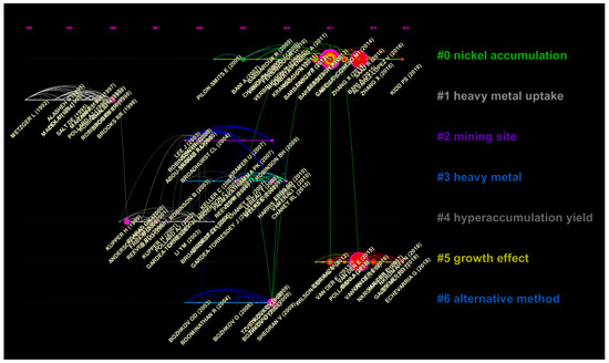The top 2% of most cited references from each year were selected to generate a co-citation network and used to explore the relationships among the references of phytomining-related publications. Based on this co-citation network, cluster analysis was carried out, and a timeline view was generated to reveal the intellectual structure of phytomining research area. In Figure 4, each node represents a cited paper, and the node size is proportional to the number of times it has been cited. Each link between two nodes indicates that they were both cited in a third paper; the thickness of the link is proportional to the number of times they were co-cited. The color of the link represents their first co-cited year and corresponds to the color on the timeline [22]. A node with strong burstiness is marked with a red center, indicating a sharp increase in its citation frequency over one year or multiple years [30].