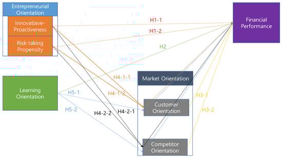 As previously mentioned, entrepreneurial orientation is the characteristic not to be satisfied with the current business state but to explore new opportunities continuously [16]. In order to create new values, entrepreneurial orientation leads to proactive, innovative, and risk-taking attitudes and behaviors [14,15,73]. In the market, proactive firms intend to become pioneers and leaders. Also, they try to take strategic initiatives by offering new products or services. Proactiveness requires firms to grasp and respond to rapidly changing customer needs and competitors’ strategies [73]. Innovativeness is the characteristic to introduce and pursue new markets, technologies, processes, products, or services that are different from competitors [17]. The reason that firms pursue innovativeness is to achieve better performances. In the end, innovative firms need to introduce and pursue innovations that should reflect changing customer needs and be consistent with the strategies responding to competitors’ threats. The risk-taking propensity is the characteristic to pursue opportunities regardless of the size of investments. Excessive risk-taking does not always result in a decent performance. Instead, it often ends with an abysmal catastrophe. In some empirical studies, the mediating effect of market orientation in the relationship between entrepreneurial orientation and financial performance has been measured [25,74,75,76]. Based on the above discussion, we set the following hypothesis.