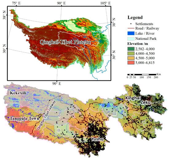 Overview of the Sanjiangyuan region. Sanjiangyuan is located in the central Qinghai–Tibet Plateau, which is a comprehensive pilot area of Sanjiangyuan National Park. Sanjiangyuan National Park consists of three main parts, (I) region of the Yangze River headwater, (II) region of the Lancangjiang River headwater, and (III) region of the Huang River headwater.