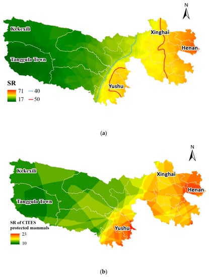 Mammal species richness and species richness of Convention on International Trade in Endangered Species of Wild Fauna and Flora (CITES)-listed mammals in the Sanjiangyuan region. Figure (a) shows the map of mammal richness in Sanjiangyuan. The lines represent the species richness isolines for 40 and 50. Figure (b) shows the map of CITES-listed mammal richness. Red color indicates high species richness while green indicates low species richness.