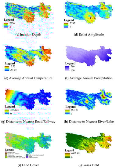 Selecting the appropriate environmental factors ensures the accuracy of the predictions. Climate (e.g., precipitation, temperature) can have an effect on species richness and human population density [36,37]. It is generally assumed that the principal factors that influence human activity are landscape and roads [38,39,40]. We also used land cover and grass yield datasets as correlative variables, which were retrieved from the National Earth System Science Data Center, National Science & Technology Infrastructure of China [41].The chosen environmental factors according to previous research are shown in Table 1. Albers projection was used in the calculation and visualization, and all the raster dataset was resampled to 30 m × 30 m resolution. Terrain factors were computed from digital elevation model (DEM) data from ASTER Global Digital Elevation Model Version 2 (ASTER GDEM2) [42]. ASTER GDEM2 was released in GeoTIFF format with a resolution of 1″ (~30 m). Terrain factors are common indicators for landscape types, and they were calculated from ASTER GDEM2 and divided into two types based on the calculation scope. One represents micro factors of a 90 m scope; the other represents macro factors of a 21 km scope. Together, they can delineate the landscape of the Sanjiangyuan region.