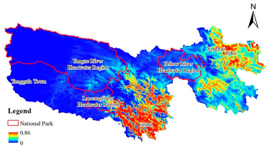 Map showing the intensity of human activities in Sanjiangyuan. Red color indicates high intensity of human activities, and blue color indicates low intensity of human activities. The boundary of the national park is shown in red line.