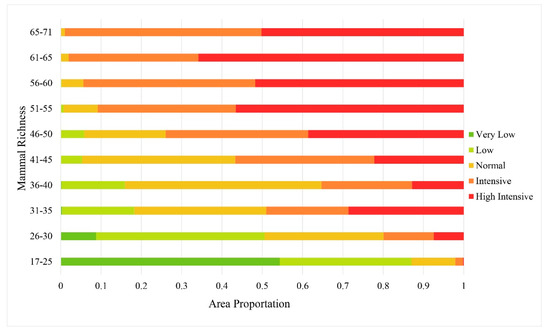 As is shown in Figure 5, a large proportion, accounting for ~55%, fall in the very low level of human activity intensity for the group 17–25. Furthermore, a small proportion, accounting for ~33%, fall in the low level. The area of high intensity increases when the mammal richness increases. Vice versa, the area of low intensity declines when mammal richness declines. The group 61–65 bears a high intensity of human activities (68% highly intensive; 31% intensive). For the group 66–71, the intensity of human activities remained high, and the proportion of highly intensive and intensive levels accounted for >99%. It shows that the more mammals there are, the higher the intensity of human activities they bear, which is the human–wildlife coexistence phenomenon.