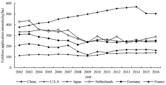 Comparison of fertilizer application intensity in typical developed countries from 2002 to 2016.