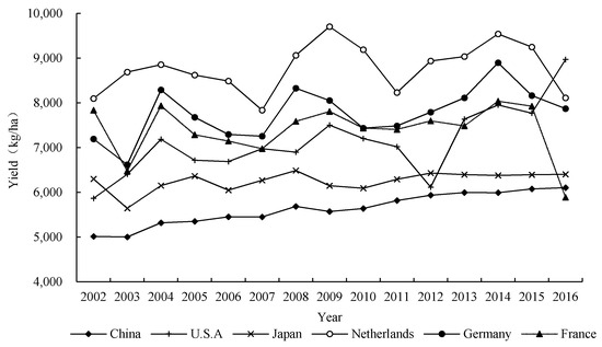 Comparison of main grain yield in typical developed countries from 2002 to 2016.