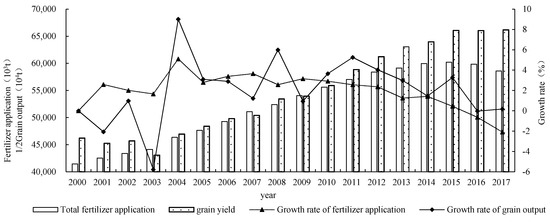 From 2000 to 2003, the grain output declined annually and the per unit yield of grain remained unchanged due to prominent problems with agriculture, rural areas, and farmers; the decline of agricultural income; and the sharp decrease in grain enthusiasm [27,28]. However, the amount of chemical fertilizer applied to the main grain crops increased continuously in the same period, and the application intensity of chemical fertilizer continued to rise.