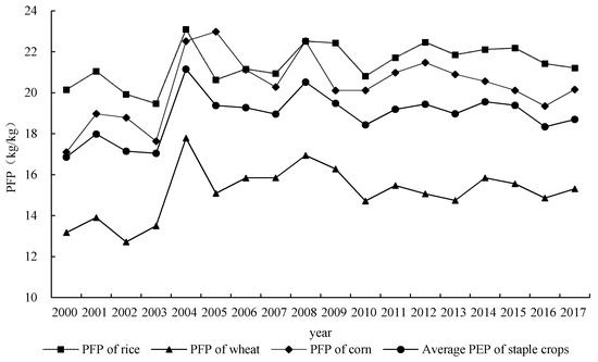 Development trends of PFP of main grain crops in China from 2000 to 2017.