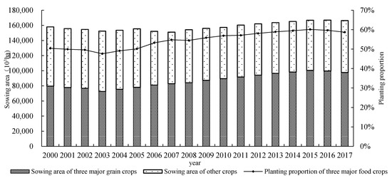 Changes in the trend of the planting area and planting structure of crops in China from 2000 to 2017.