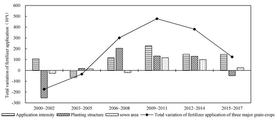 The fertilizer consumption of rice, wheat, and corn accounts for more than 50.00% of China’s total fertilizer consumption. Thus, the main factor affecting China’s total fertilizer demand is still the fertilizer demand of the main grain crops. Based on the decomposition of factors such as application intensity, planting structure, and sown area, we further studied the contribution rates of the major crops to the total chemical fertilizer application. The decomposition results for each time period are shown in Table 4. Since 2000, the amount of chemical fertilizer application for the major crops cumulatively increased by 10.79 million tons, and the cumulative contribution to China’s total chemical fertilizer application reached 62.14%. This was the main reason for the increase in chemical fertilizer application in China, in which the effect of application intensity was the most prominent.