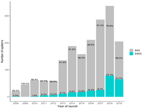 Figure 1, BSSs offering both conventional and electric bikes are classified as e-BSSs, representing a partial or full electrification of the bike fleet. Focusing on the average annual growth rate of e-BSSs during the decade 2008–2018, it is estimated at 79.3%. Moreover, by the comparison of annual growth rates, three major milestones can be identified, reflecting different innovation maturity stages concerning bikesharing technology. An abrupt increase can be traced to the variation in figures from 2012 to 2013, with 59 systems (53 BSSs and 6 e-BSSs) launching in 2012 compared with 135 in 2013 (124 BSSs and 11 e-BSSs), translating to a 129% increase in deployment. Next, a deceleration can be observed from 2014 to 2015, reflecting the failure of third generation bikesharing technology to convince in terms of operability and scalability, equivalent to a 16% decrease. From 2015 till the peak observed in 2018, an increasing growth trend is recorded (139% over three years), with 2018 topping deployment rates with a total of 337 systems (259 BSSs and 78 e-BSSs) starting their operation during that year. More specifically, e-BSSs expanded from 17 launches in 2015 to 78 in 2018, corresponding to an almost 4-fold growth. The latter can be accounted to the introduction of massive systems in China and the USA, along with dockless bikesharing gaining acceptance and persuading investors as a reliable solution. Interestingly, figures for 2019 underline the potential of e-BSSs to scale-up and compete with conventional BSSs, since 31.7% of service launches (65 e-BSSs) were e-bike-based.