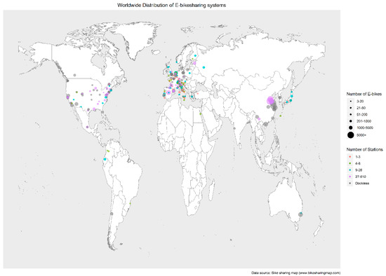 20]. The largest recorded roll-out was 5000 e-bikes in two Chinese cities, namely Yangzhou and Shunyang, while in Europe, the largest roll-outs are recorded for Madrid (BiciMAD around 2000 e-bikes, launched 2014), Amsterdam (Urbee 1150 e-bikes, launched 2016), Brussels (Uber 1200 dockless e-bikes, started in 2019) and Milan (BikeMi, 1000 e-bikes, launched 2016). A dockless e-BSS in San Diego was the largest roll-out for North America, where the most frequent value for initial fleet size was 500. Evidently, larger systems launch in Chinese cities, while flexible access to shared e-bikes (dockless shared fleet) is more favored for large-scale deployments.