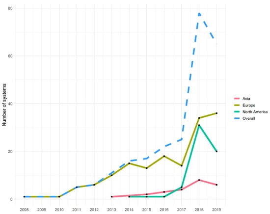 Figure 3 details the number of new systems per year in Europe, North America and Asia, as well as the overall worldwide trend. All curves resemble a sigmoid curve, in accordance with the key feature of innovation diffusion theory [