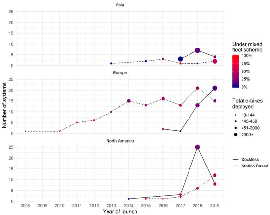 Since a global outlook on the uptake of e-BSSs has been provided in the previous section, it is yet essential to detail the spatio-temporal trends per region. It can be noted that the e-BSS is becoming a considerable alternative in bikesharing as proven by the respective shares of launches per system type worldwide, specifically during the past two years. Large-scale deployments infer higher initial capital investment costs when contrasted with conventional BSSs, and when considering the average market purchase value of an e-bike in relation to that of a regular bike.