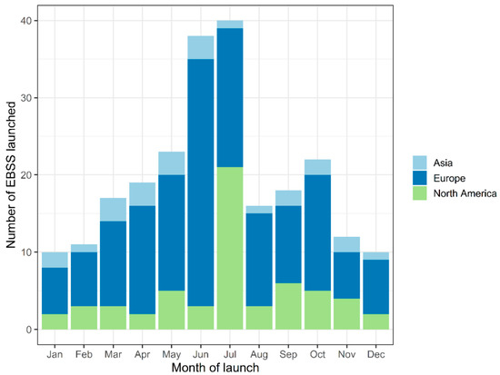 Another factor for e-BSS deployment unraveling further details on the temporal characteristics of the diffusion was the monthly seasonality of launches per region.