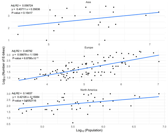 Figure 6 demonstrates the resulting plots with their respective fitted linear regression curves. Clearly, a low correlation (0.0567) pinpoints the inadequacy of the fitted curve to describe the relationship between the data points from Asia, suggesting that a polynomial relationship could improve the regression model’s accuracy. By comparing the strengths of correlation, attempting to model the relationship between population and fleet size fails to score a reasonable adjusted R squared value for Asia, therefore contradicting the initial hypothesis. Nevertheless, the assumption is confirmed for the remaining two regions with calculated correlations higher than the results presented for the early stages of the bikesharing technology diffusion in [