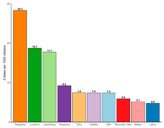Figure 8) were scaled on e-bike availability per 1000 citizens for the purposes of comparability with previous studies. It can be noted that Tengzhou, China ranks in first place with 28.3 e-bikes per 1000 citizens, along with four other Chinese cities (i.e., Liaocheng third, Yangzhou fourth and Dali seventh), followed by Locarno, Italy with 18.7 e-bikes per 1000 citizens. Highly performing European cities are also Tartu, Estonia and Valetta, Malta, with their rate computed from only one system serving small populations in both cities, i.e., 750 e-bikes deployed in Tartu and 50 e-bikes in Valetta, whereas Chinese cities with 15 entries tallying 32,340 e-bikes present a more reliable figure. For example, the US market, which is highly incorporated in the population quota dataset with 43 entries, recorded two top-ranking cities with 5.9 and 5.1 e-bikes per 1000 citizens over an average country level of 1. In contrast, Italy, the second most represented country in terms of the number of systems (i.e., 28 in