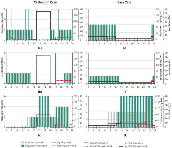 Usage loads and occupation period Calibration case: (a) Bedroom 1, (b) Bedroom 2, (c) Hall; Base Case (d), Bedroom 1, (e) Bedroom 2–3, (f) Living-room.
