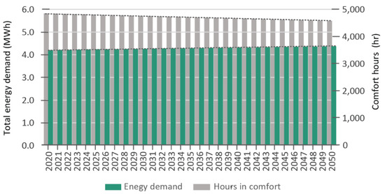 Annual variation of the energy demand and hours in comfort for the 2020–2050 period, in Case L.