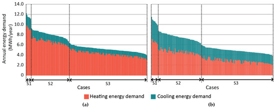 In addition, the variation by type of demand (heating and cooling) is obtained between the scenarios. For all the cases, in both scenarios, the heating demand is higher than the cooling demand, and both demands have higher levels for S1, followed by the cases of S2 and lower levels in S3.