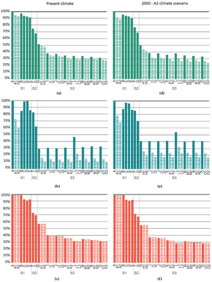 Therefore, the identified sections determine the maximum level of reduction of the demand by type of construction improvement. This means that for S1, there is a maximum reduction versus the base case of 9.1% in the current climate and of up to 14.3% in the A2 2050 scenario. S2 varies between a reduction of 24.1% and 44.6% for the current climate and between 23.5% and 45.2% for the A2 2050 scenario. Meanwhile S3 varies between 45.6% and 68.2% and between 48.8% and 66.8% for the current and future climates, respectively.
