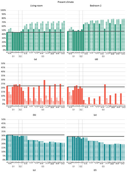Case L once again is a stand out case of this group, as it had an increase of discomfort due to heat of between 2.7% and 7.1% in both rooms and scenarios, showing how much of an impact the improvement in insulation and airtightness levels can have without a suitable use of solar protections.