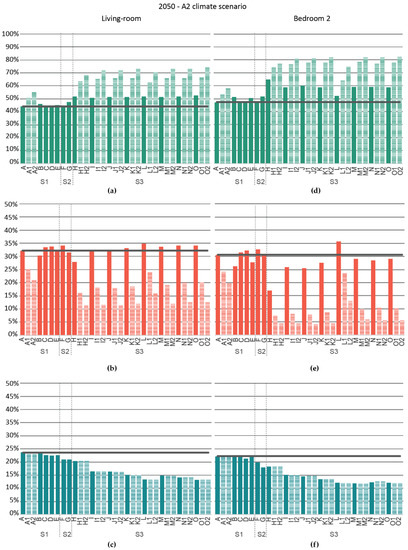 Percentage of time in comfort or discomfort by case study versus the base case, A2 2050 climate scenario, Living room: (a) Total time in comfort, (b) Time in discomfort due to heat, (c) Time in discomfort due to cold, Bedroom 2: (d) Total time in comfort, (e) Time in discomfort due to heat, (f) Time in discomfort due to cold.