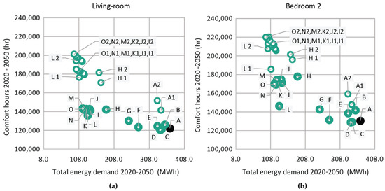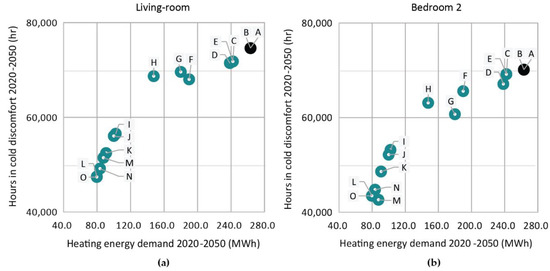 Both analyses present little variation of the total demand and total time in comfort between scenarios, although a variation in their composition is confirmed. As a result of the temperature increase expected in future scenarios, the base case dwelling will experience an increase of 2.0 MWh/year in the cooling demand and an average increase of discomfort from heat of 800 hours, just as occurs in other similar studies [13,22].