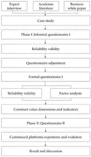 In this study, based on the customer value theory, a questionnaire-based survey was conducted on the users (consumers) of Chinese men’s clothing digital customization platforms to explore the factors that affect the perception of customer value in clothing customization and build a customer value dimension. This study not only extends the literature on the customer value of clothing customization under digital technology but also provides data for understanding the sustainable development of China’s clothing customization consumer market. The implementation process used in this study is shown in Figure 1.