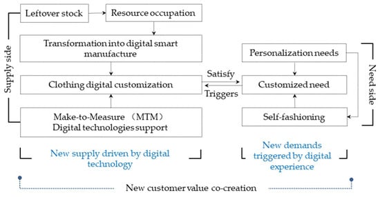 Digital clothing customization is based on traditional clothing customization and ready-to-wear production. It provides consumers with digital clothing customization solutions. Fashion retailers using new interactive digital technology formats (online and offline retail, including new hybrid environments) can increase customer engagement in shopping [4]. Properly driven digital transformation can reshape the fashion industry into a more sustainable and truly customer-oriented business [5]. Digital sales and manufacturing, as well as circular value networks, can contribute to business models that support sustainable development in the textile and apparel industries [6]. Digital customization meets the requirements of comfort, while at the same time allowing industrialized mass production and more competitive pricing. China has a large number of young Internet users, creating conditions for the rapid commercial use of new digital business models. The demand side and supply side of Chinese clothing customization rely on the convenience provided by digitalization to create co-creation value (see Figure 2).