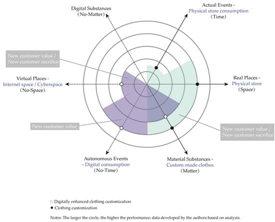 Pine II and Korn [29] put forward the framework of a multiverse, using “time, no time, space, no space, matter, and no matter” as the six variables to describe how experiences happen. Here, according to the framework of the multiverse, we describe the change of perceived value in the consumption experience of clothing customization in the digital economy (Figure 3). In the space of digital consumption and physical consumption, new customer value will increase or decrease new customer sacrifice. Customer satisfaction is the difference between what a customer wants, and what they settle for [29]. In the dimension of “time”, digital customization shows its advantages and produces new customer value; in the dimension of “space”, it brings about new consumer experiences (this is new customer value, accompanied by new customer sacrifice); in the dimension of “substances”, the gap between customized production clothing and customized store clothing is narrowing. We believe that, through the iteration of digital technology, new customer sacrifice will gradually decrease. The starting point of this study is to reduce customer sacrifice and take clothing as both a product and a representation of self-fashioning. This study aims to explore the latent new customer value indicators in the digital customization of the clothing consumption experience, to guide the sustainable development of clothing customization marketing practice.