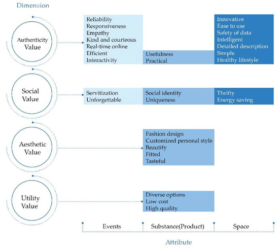 The first dimension was called authenticity value. Throsby [44] stated that authenticity value “refers to the fact that the work is the real, original, and unique artwork which it is represented to be.” Digital clothing customization first needs to meet consumers’ basic functional requirements: usefulness and practicality. The customized service delivery methods also have become more diversified. The requirements for online customer service have changed significantly, which have become more detailed, including reliability, responsiveness, empathy, kind and courteous tone, real-time online presence, and efficiency. The value of digital clothing customization is generated during the online interaction between consumers and customer service. The customization platform requires using digital technology in the content of clothing customization. Content refers to the detailed information that clothing as a product needs to be displayed on a digital platform; the display of product content is assisted and empowered by digital solutions, including user connectivity, applets, clouds, and AIs. Content requires many perspectives and dimensions to be able to connect the product’s functions. This includes the product dimensions of innovative, easy to use, safety of data, intelligent, detailed description, simple, interactive, and healthy lifestyle.