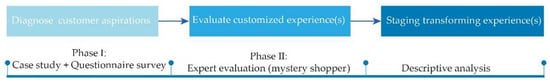 Through the factor analysis of Phase I, we obtained the customer value variables (demand side) of the custom apparel consumer. In Phase II, we used Phase I indicators to score performance for customized platforms. The end goal of the analysis was to understand the new consumer experience of digital customization and customer evaluation (Figure 6).