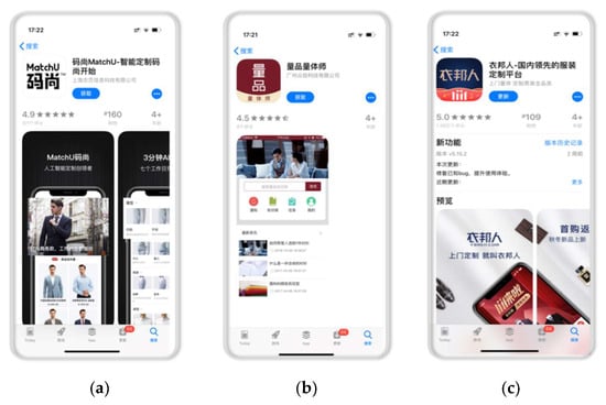 - Chen, Y.Y. Study on the Influencing Factors of Customers Choosing Online Apparel Customization. Master’s Thesis, Harbin University of commerce, Harbin, China, 2018. [Google Scholar]