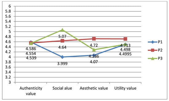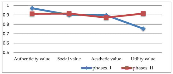 By rotating the axis, the tendency of each factor (axis) to be uncorrelated with the variable could be strengthened so that several questions that were already very relevant remained high-loading, which was conducive to the naming and interpretation of the factors. The criterion of factor load was 0.71 for excellent, 0.63 for very good, 0.55 for good, and the one with the largest loading score was given priority. The factor loading score of the authenticity value component was 0.971; the factor loading score for the social value component was 0.901; the factor loading score for the aesthetic value component was 0.897, and the factor loading score for the utility value component was 0.754. Table 10 shows that the loading scores of the four factors were all excellent and suitable for factor naming.