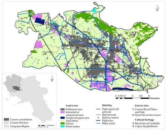 The territory under analysis, inhabited today by about 320,000 people, is divided into 1014 census sections and is influenced by a high housing density, with an average of 2128 inhabitants/km2 and high urbanization. It contains productive centers important for the whole of Southern Italy, such as the industrial agglomeration of Marcianise. Furthermore, it has a cultural heritage of great interest, which includes two UNESCO sites—the famous Royal Palace of Caserta, with its monumental park, and the Royal Site of San Leucio (Figure 1). The level of environmental pollution is significant due to existing production activities and the disposal, often illegal, of solid urban waste.