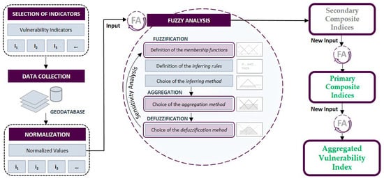 As a first step, the basic indicators selected for each domain are divided into subdomains representative of the vulnerability factors, according to a hierarchical framework. The quantitative values of the basic indicators, referring to the census sections, which are chosen as the minimum spatial mapping unit are organized within a geodatabase. These values, subsequently normalized, constitute the input data for the fuzzy analysis. The latter consists of some main phases which, starting from input data, lead to the required output, in particular the following: Fuzzification, through the definition of membership functions; inference; aggregation; defuzzification. As a model calibration, in order to reduce the subjectivity of the choices made in each of the four phases, a sensitivity analysis was performed by testing different fuzzy schemes obtained by varying the membership functions, the inference method, the aggregation method, and the method of defuzzification. As a discriminant for the choice of the better scheme, the standard deviations of the outputs of all the performed fuzzy analyses are compared with the ones of the input data: The scheme to be selected is the one that guarantees input and output distributions characterized by similar dispersion. In this way, the secondary composite indices, representative of the subdomains, are obtained first, then the primary composite indices, relating to the domains, and finally, the composite index of aggregated vulnerability.