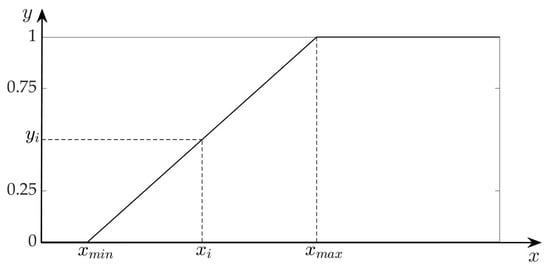 This formula takes into account the fact that all the indicators have positive polarity, i.e., an increment in their value corresponds to a growth in the potential degradation in the different dimensions, therefore an increase of the vulnerability in the latter. The domain of each normalized indicator consists of the interval (0, 1), where 1 corresponds to the maximum degree of criticality or potential degradation, while 0 represents the minimum one (Figure 3).