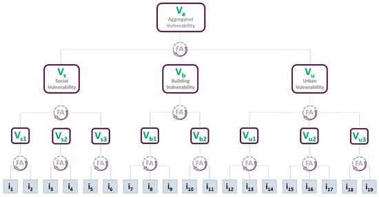 The latter constitute input data for the subsequent fuzzy analysis, which returns as output, at an even higher level, the primary composite indices, representative of the vulnerability in the three social, building, and urban domains. The last analysis is performed by assuming the primary composite indices as input data, so as to define the final output, constituted by the aggregated vulnerability index, at the highest level of the hierarchical scheme.