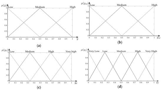 Triangular membership functions: (a) Normalized indicators y; (b) secondary composite indices ysd,inp and ysd,out; (c) primary composite indices yd,out and yd,inp; (d) final output yf.