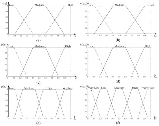 Trapezoidal membership functions: (a) Normalized indicators y; (b) secondary composite indices ysd,out and ysd,inp; (c) with reduced transition area, for normalized indicators y; (d) with reduced transition area, for secondary composite indices ysd,out and ysd,inp; (e) primary composite indices yd,out and yd,inp; (f) final output yf.