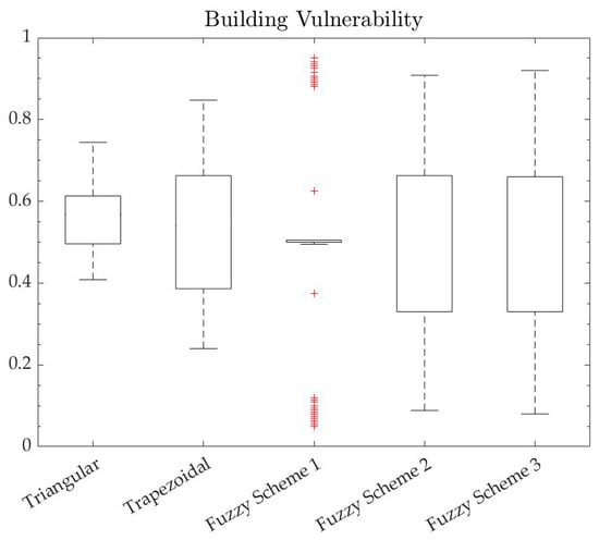 The results of the different simulations were then observed by comparing the standard deviation of the output values and of the input values. In this way, the scheme that guarantees similar dispersion values was found to be the second one, characterized by the min–max as the inference method, the sum as the aggregation method, and the centroid as the defuzzification method. For the sake of clarity, the box plot relative to the composite building vulnerability index is shown in Figure 7, which allows a quick observation of the results of the analysis