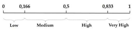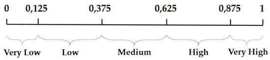 Once the choices consequent to the sensitivity analysis have been made, the defuzzified values for the primary composite indices and the composite aggregated vulnerability index must be converted back into linguistic values, corresponding to crisp vulnerability classes, so as to be able to carry out mapping. In particular, the linguistic values for the primary composite indices, associated with the four classes (low, medium, high, and very high) have been obtained by posing the defuzzified output values in the ranges on the scale from 0 to 1 shown in Figure 8. On the other hand, the defuzzified value of the composite index of aggregated vulnerability has been converted back into a linguistic value corresponding to the five classes (very low, low, medium, high, and very high), by individuating its position in the ranges shown in Figure 9.