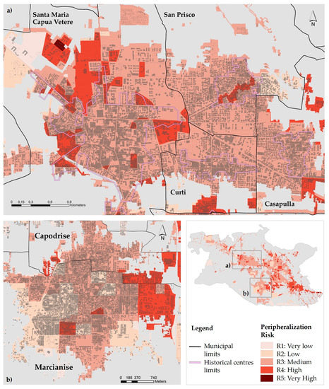 The risk map, thus obtained, shows how severe peripheralization processes, identifiable spatially where the risk level is high and very high, can affect both neighborhoods traditionally considered peripheral, such as the case of the economic and popular building area falling in the Municipality of Marcianise, both typically central neighborhoods, within historic agglomerations, as in the cases of the municipalities of Capua, Caserta, Casagiove, Maddaloni, Recale, San Marco Evangelista, Santa Maria Capua Vetere, and San Prisco (Figure 15). The case of Maddaloni, which lays in the south-east part of the study area, may be considered emblematic, since such a municipality is characterized by the largest number of areas affected by high risk, and it turns out to be at risk of peripheralization as a whole. In the Municipality of Marcianise, the aforementioned area, which is the largest among the high-risk ones in the municipal territory, results from the implementation of an economic and social housing plan (PEEP), established by the general urban plan (PRG), pursuant to law April 18th 1962, n. 167. In fact, it is characterized by a high percentage of social housing, and presents the characteristics of a typical urban periphery, as conceived in the Italian urbanistic tradition, i.e., a more or less extensive neighborhood, located on the edge of the consolidated city and inhabited by the weaker sections of the population. In particular, in this area, social and urban vulnerabilities contribute at the determination of a high risk, as is evident by observing the maps related to these domains. The fact that, in several municipalities, neighborhoods or sets of contiguous neighborhoods present a high risk even in ancient buildings agglomerations, manifesting the phenomenon of the peripheralization of historic centers [7,20], which is ongoing in numerous Italian cities. A relevant role in the development of this process has been played by the evolution of the real estate market and of the land rent, which have led the population and, in particular, the middle classes, to move from the historical centers to the traditional peripheries, built-up on their edges in place of agricultural land, or, in more recent years, towards peri-urban areas characterized by a low housing density [3,5]. On the other hand, within the conurbation, the municipality of Maddaloni is configured as a city-periphery, widely affected by potential degradation in all the considered domains, a circumstance that determines a significant vulnerability and, consequently, an extended risk of peripheralization.